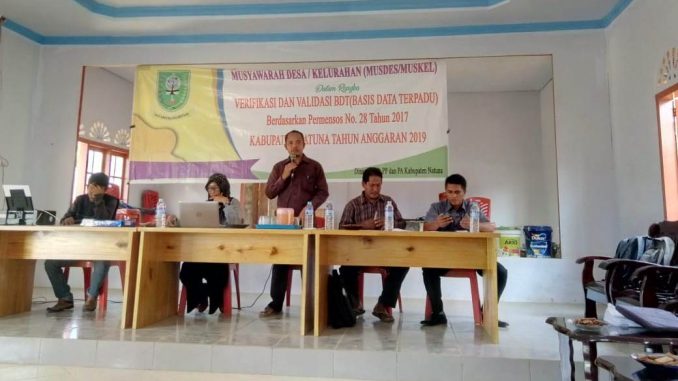 Tim Verifikasi dan Validasi Dinas Sosial (Dinsos) Kabupaten Natuna, melaksanakan musyawarah desa (Musdes) terkait Basis Data Terpadu (BDT) di gedung pertemuan Air Batang desa Mekar Jaya tanggal 6 April 2019 jam 14.00 WIB.